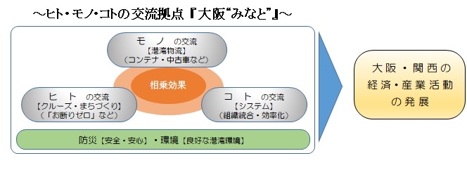 大阪港湾局では、大阪港と府営港湾の強みを生かし、弱みを補完のうえ、全体で機能分担や最適配置を図り、大阪港及び府営港湾をヒト・モノ・コトがより一層交流する拠点として発展させ、安全・安心で良好な港湾環境のもと、背後圏にまで賑わいを図り、関西経済の発展の一翼を担うことをめざします。