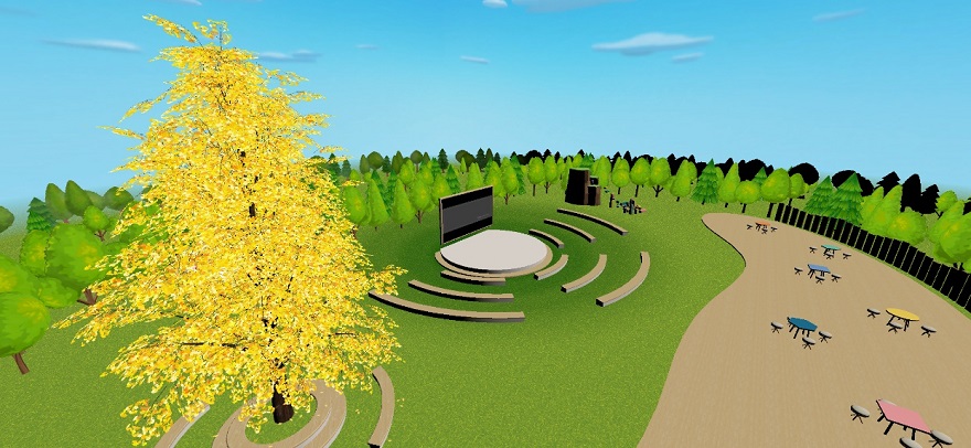 メインエリアは自然あふれる公園のイメージで、大阪府のシンボルツリー「イチョウ」、イベントエリアには発表ができるステージと映像を投影できるスクリーンが設置されており、国内外のさまざまな人が集い一体感のあるイベントの実施ができる仕様になっています。