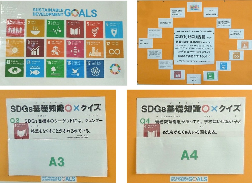 校内随所にSDGsに関する掲示物を掲示しています。日常の学校生活において生徒がSDGsに興味を持ち、17のゴールに向けて自分にできることを考えられるように、環境づくりを進めています。