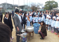 小学校では「おやじの会」やPTAの協力を得て地域の田んぼをお借りし、田植え・稲刈り体験を行っています。12月末にはそのお米を使い、餅つき大会を実施します。当日は餅つきを待ちかねた子どもたちが満面の笑みを浮かべながら、「よいしょっ!」の掛け声とともに、順番に一人ずつ餅をつかせていただきました。