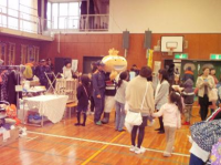 中学校体育館内で、生徒が各部活動ごとにブースを設け、子どもから大人までを対象にしたお店を展開しました。各ブースは工夫されており、子どもからお年寄りまでたくさんのお客さんが訪れ、活気に満ちあふれていました。