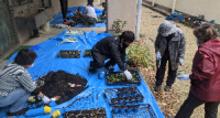 中学校が学校で花を種から育て、生育した苗をポットに移し替える作業を地域の人と一緒に行いました。普段からあいさつ運動で協力いただいている更生保護の方などとも親睦を深めながら作業しました。