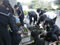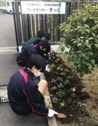ボランティア委員の生徒たちが中心となり、隣接する障害者福祉施設で、季節の花を植える活動を行いました。
