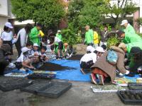 暑い中での作業ですが、子供たちも地域の方々も熱心に張り芝や蒔き芝などに取り組んでいただきました。作業後のかき氷もおいしくいただきました。