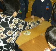 地域の老人の方々に学校に来ていただいて、昔遊びを教えてもらいました。紙飛行機・けんだま・だるまおとし・福笑い・あやとり・おじゃみ等たくさんの昔遊びを教えていただきました。普段はテレビゲームになれて、この機会に教えてもらった遊びについては、初めての体験という子どもたちが多く、かえって新鮮な遊びと感じた子も多くいました。けんだまも、お皿に乗るまで真剣な目つきで挑戦する子、福笑いでは意外な顔になって、大笑いする子、だるま落としでは、土台と一緒に飛んでしまった子、最初は思うように行かなかったのが、何度もやっているうちに、だんだん上手になっていくのがうれしそうでした。地域の老人の方々も、孫を見るように一生懸命、またほほえましく教えてくださいました。