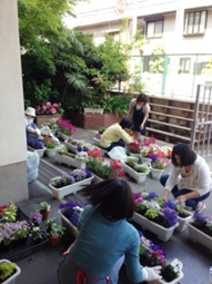 毎月1回、花ボランティア「ハナミズキ」の方々にお越しいただき、教職員とともに校内の花や樹木のお世話をいただいています。季節ごとの花の苗をプランターに植えたり、入学式・卒業式等を彩る花を準備いただいたりしています。