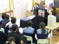 また、生徒向けに紙芝居を上演してくれて、読書の楽しさを勧めていただいています。最初の頃は、恥ずかしそうに見ていた子ども達もボランティアさんの気持ちのこもった語りを前に、後半は食い入るように聞き入っていました。