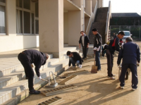 5、6時限目の総合学習の時間を利用して全校生徒が参加。老人クラブの方々約60人と一緒に、学校内や学校の周囲にある植え込みなどでのゴミ拾い、木々の剪定やみぞ掃除などをおこないました。生徒たちは高齢者の方が剪定された枝や枯葉などの袋詰め、箒履き等の活動を色々な話をしながら行いました。