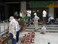 地域の学校を綺麗にしようという常盤・光明 両市民協議会の方々の声で4年前から始まったこのボランティア。今年はPTA方々もあわせて約40名に集まっていただき、生徒・教職員も約70名が参加し、花の植え替えが行われました。たくさんの方にご協力いただいたお陰で、校内のみならず、学校前にも花壇を作っていただきました。花の植え方から詳しく教えていただき、地域の方と生徒達とのおもしろい会話もここかしこで聞く事ができました。休日の水やりや日頃の手入れもボランティアの方々が率先して行ってくれています。