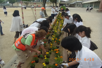 6月18日(火曜日)、11月20日(水曜日)の放課後に、ボランティアの生徒、PTA役員、教職員が集まり、親地の会(地域ボランティア団体)に植え方を指導いただいて、校庭の花壇に花の苗を延べ1,700個植えました。集まった生徒は延べ127名、みんなで土まみれになりながら植えた鮮やかな花で、校庭はいっぺんに明るくなりました。