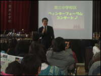 三中校区では、平成15年度からウィンターコンサートを開いてきましたが、21年度より学校支援地域本部事業の成果報告を入れてウィンター・フォーラム・コンサートとして開催しています。本年度は、12月10日(土曜日)午後2時から滝井小学校体育館で開催し、第一部「地域に根ざした学校園づくり」学校支援地域本部事業交流として(1)二中校区の取組み(2)三中校区の取組みの報告・交流を行う中で、本校区の特色(幼・小・中間の距離の近さ)を生かした(1)双方向に交流しあう「あいさつ運動」や幼稚園の運動会に卒園の三中生の参加、また、滝井小と春日小の6年生同士の合同授業、合同スポーツ大会、さらには、滝井小と同じ敷地内にあるふみぞの幼稚園との日常的な交流に加え、春日小と「もうすぐ1年生」の交流、小学校から三中へのクラブ体験と授業体験をする「オープンスクール」などやその他、教師間の合同研修会の取組みなどが報告されました。次いで第二部では、(1)合唱・合奏(滝井小学校4年生)(2)第三中学校吹奏楽部演奏(3)第三中学校・守口市青少年吹奏楽団コラボ演奏(4)守口市青少年吹奏楽団による楽器の楽しい説明と演奏など参加者に満足一杯の催しでした。