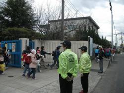 集団下校の際には、登校時と同様に配慮の必要な箇所に立っていただくとともに、学校にボランティアの方々が集まって集団の最後尾を子どもたちと一緒に下校していただいています。
