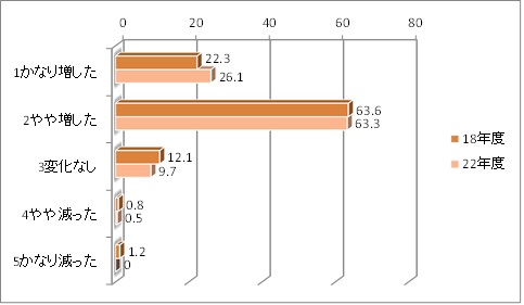 学校も地域も、「学校に関わってくれる人が増え」、「学習内容や学習形態も豊かに」なり、「教師の負担減」につながっているという回答がH18年度に比べて大きく増加している。