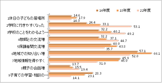 学校では、特に「(地域での)子どもと大人の交流が増えた」、地域では、「住民が学校に行きやすくなった」という回答がH18年度に比べて大きく増加している。